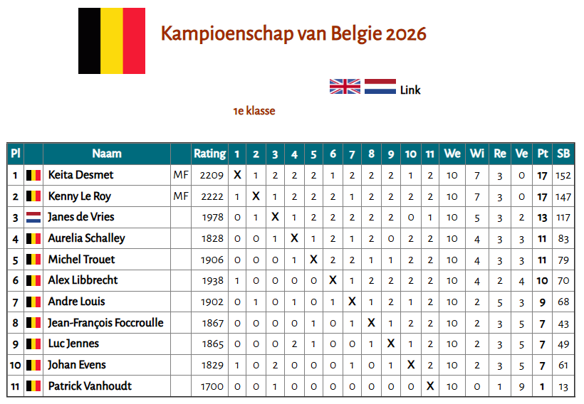 In het Belgische kampioenschap dit jaar maar een deelneem(st)er van onze vereniging. Vorig jaar debuteerde Aurelia in het B kampioenschap van België en verdiende een plek in het A kampioenschap. Andere voor Geleen spelende toppers deden dit jaar niet mee en dus was het BK vooral een strijd tussen de twee ervaren mannen uit Kortrijk Kenny Le Roy (o.a. oud winnaar in Brunssum-open) en Keita Desmet (speelde ooit wel nog eens een paar wedstrijden voor Geleen) waren met afstand favoriet gezien hun staat van dienst en daarbij behorende rating. Behalve onderling remise speelden de twee toppers nog twee keer gelijk waarna de titel voor Desmet was op grond van betere SB score.