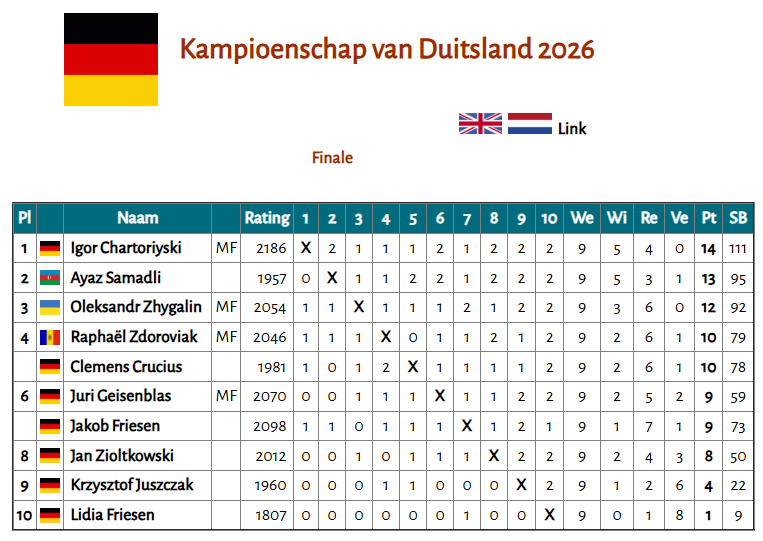 De afgelopen weken zijn de nationale kampioenschappen van zowel Duitsland als België gespeeld en het waren zeer succesvolle kampioenschappen voor spelers van onze vereniging.Gedurende de carnavalsdagen was in Korbach het Duitse kampioenschap met een finale van 10 spelers. Voor de derde keer op rij ging de titel naar Igor Chartoriyski die duidelijk de sterkste was. De tweede plek ging naar een totaal nieuwe naam. Ayaz Samadli uit Azerbeidzjan hij behaalde de tweede plek Met een puntje meer dan ‘onze’ Olexander Zhygalin die ook debuteerde in het Duitse kampioenschap.